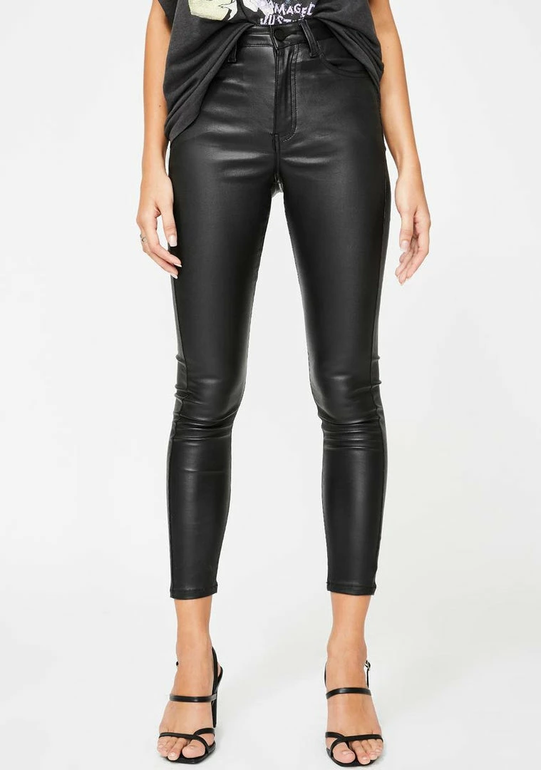 will get ya in a grunge mood. Stay slick in these vegan leather skinny pants that have a high waist fit, an ankle cropped length Nâ a zip fly closure.