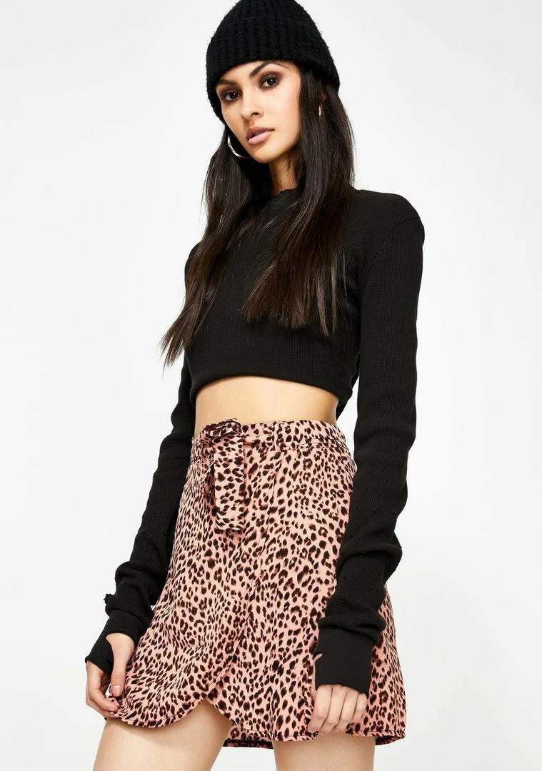 hear her roar! Youâll be goinâ wild in this fierce lil mini skirt that has a high waist fit, a wrap design Nâ a leopard print all ova.