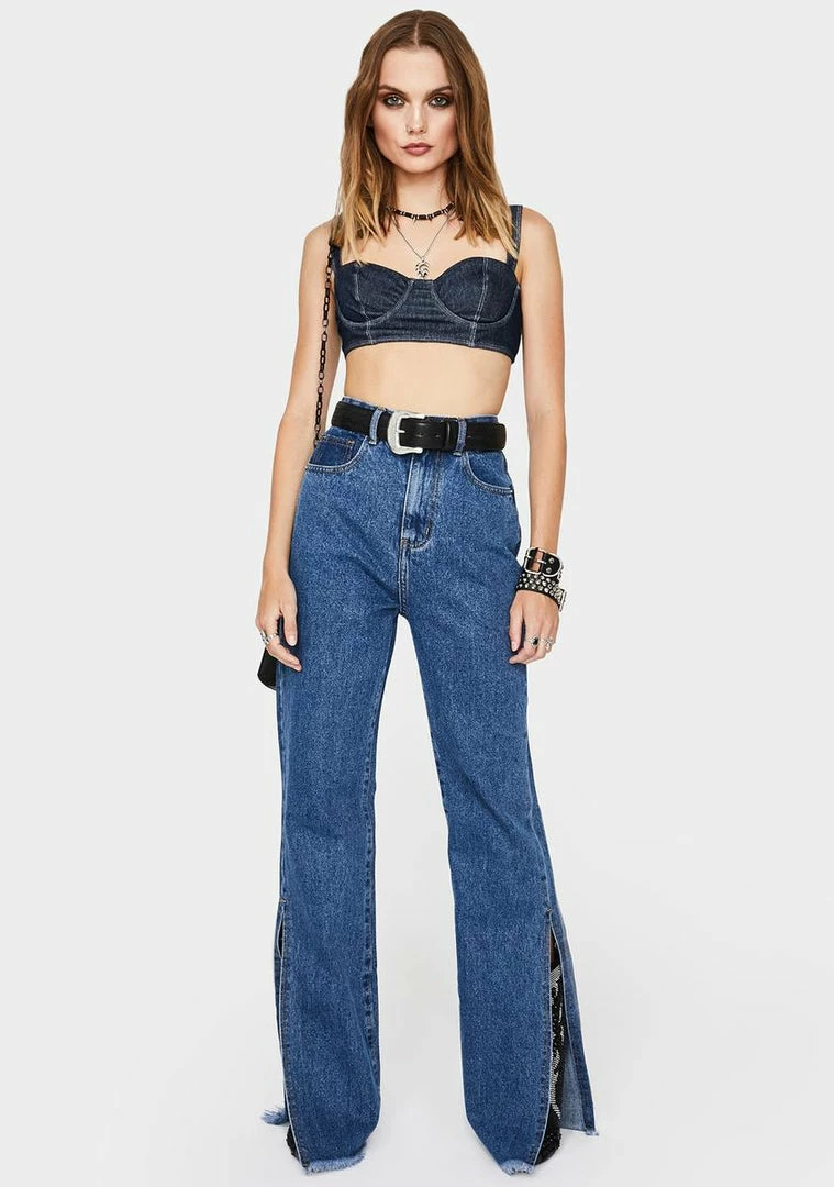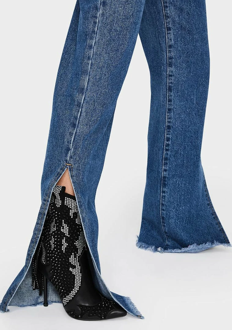 apologize for nothing, babe. These high waisted denim jeans have an extra long wide leg fit, front and back pockets, split flare hems and button zip closures.