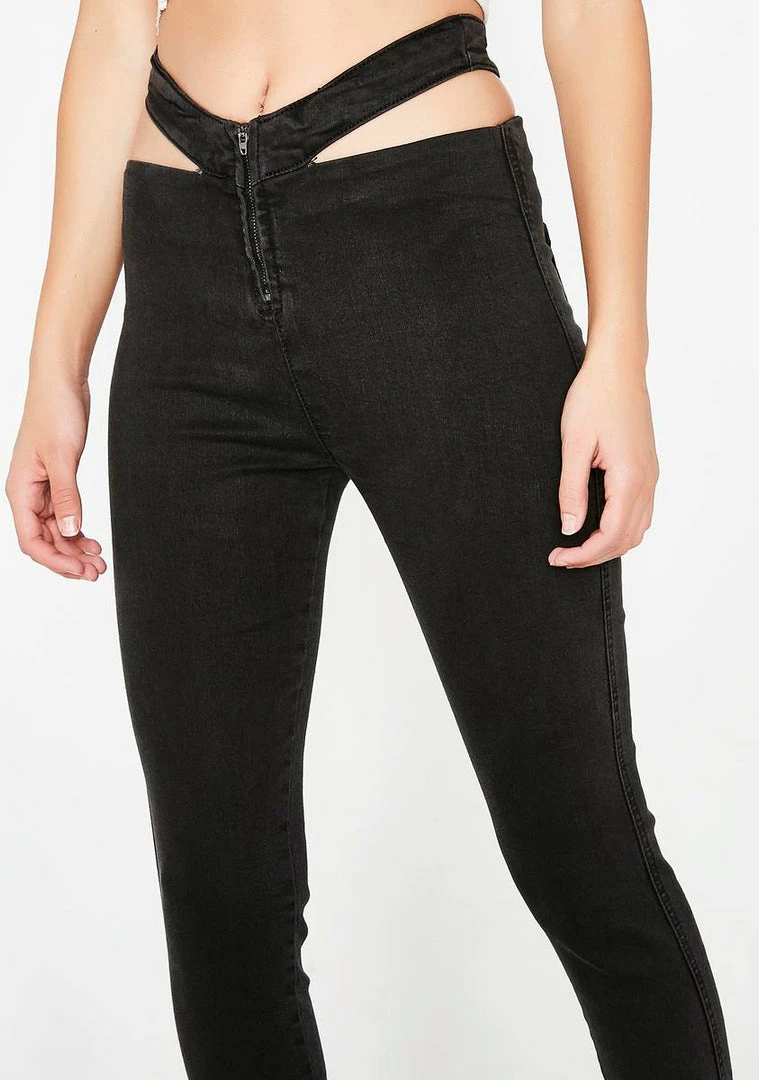 will have âem doinâ a double take. Youâre one bad biddie in these high waist denim jeans that have hip cut outs, a fly closure, and a supa skinny fit.