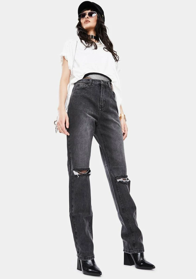 feature a washed denim design, high waist and relaxed leg fit, and ripped knees.
