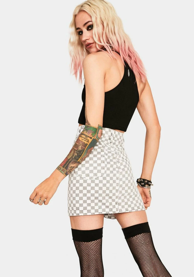 Youâre always getting checked out–your skirt should be checked out too! This denim mini has a high waist fit, front & back pockets, and an all over racing check print.