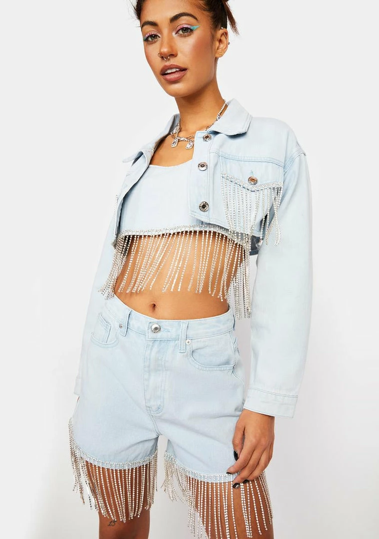 there’s no such thing as too much bling. This denim jacket has a light wash construction, two breast pockets, front button closures, diamante fringe along the hem, and a cropped fit.