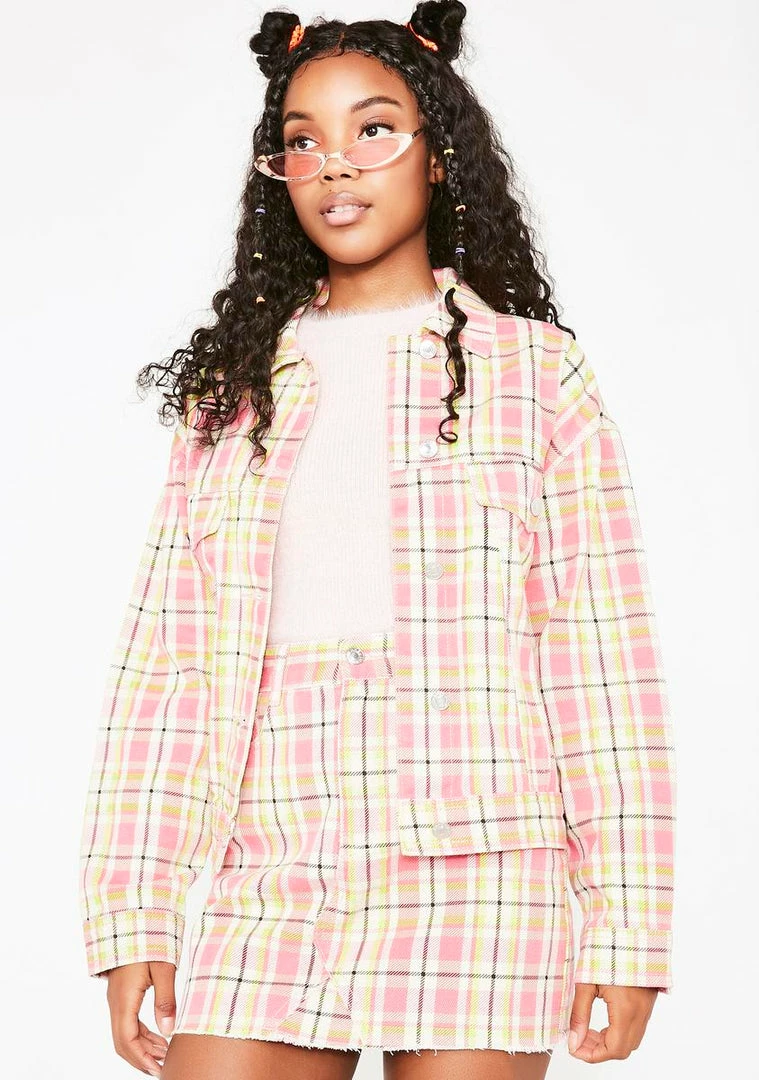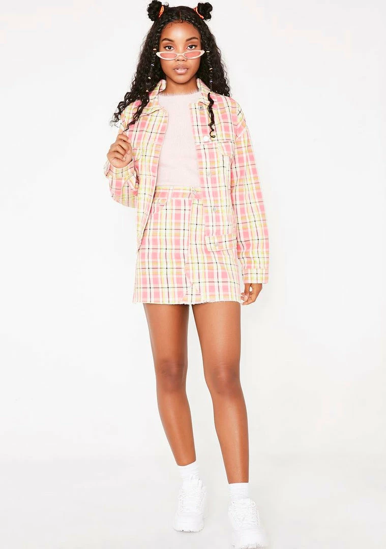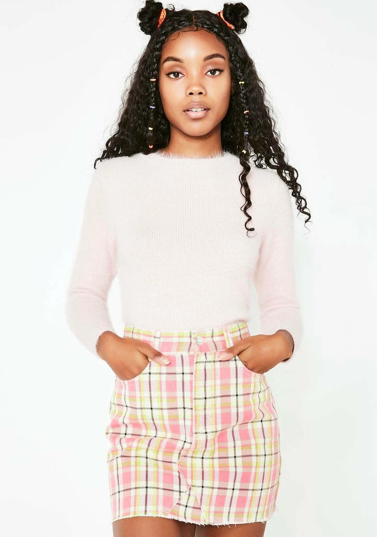 cuz on Wednesdays, you wear pink bb. Look cute AF in this plaid mini skirt that has a frayed hem and a button Nâ zip closure.