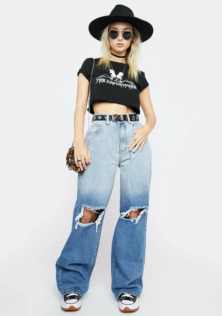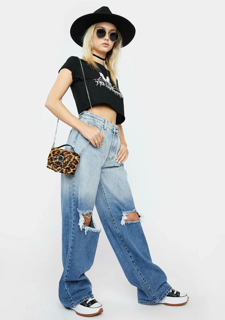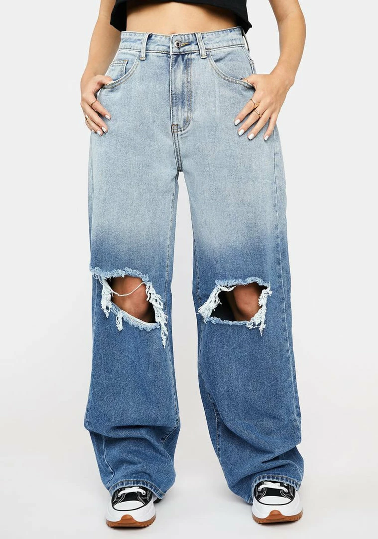 you’ve got it made in the shade. These high-rise denim jeans have an ombre dip dye design, a baggy wide leg fit, distressed tears at the knees, and a zip fly closure.