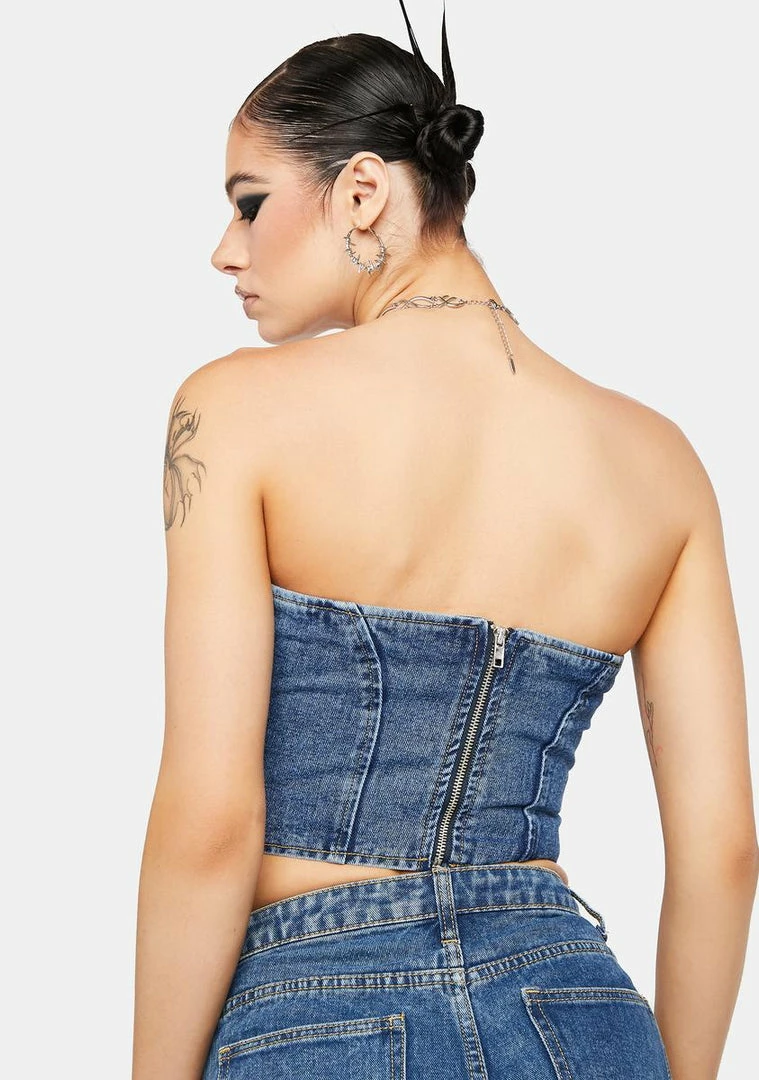 cuz you caught them looking. This corset has a denim construction, structured boning, a pointed hem, a cropped fit, and a back zip closure.