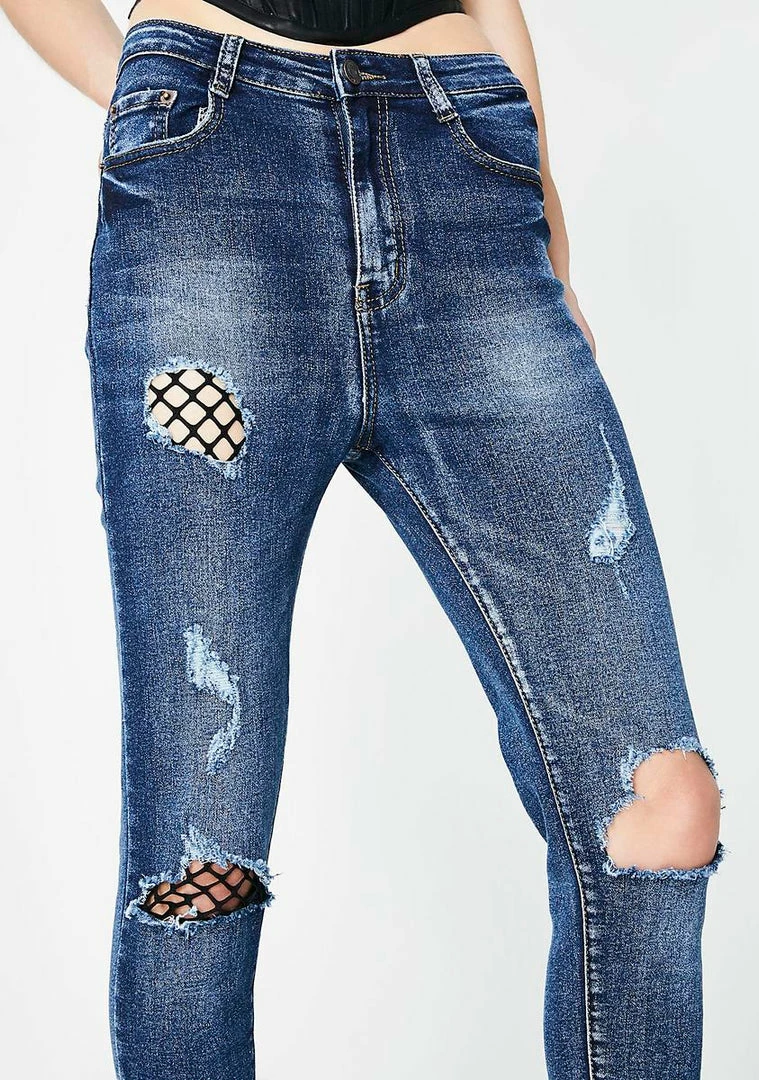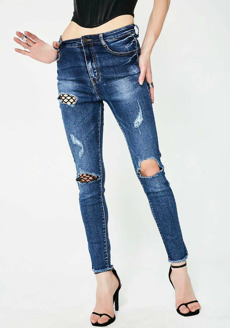 cuz youâre a good catch. Have emâ wanting your attention with these skinny jeans that have distressed Nâ fishnet details, a five pocket design and a zip fly closure.