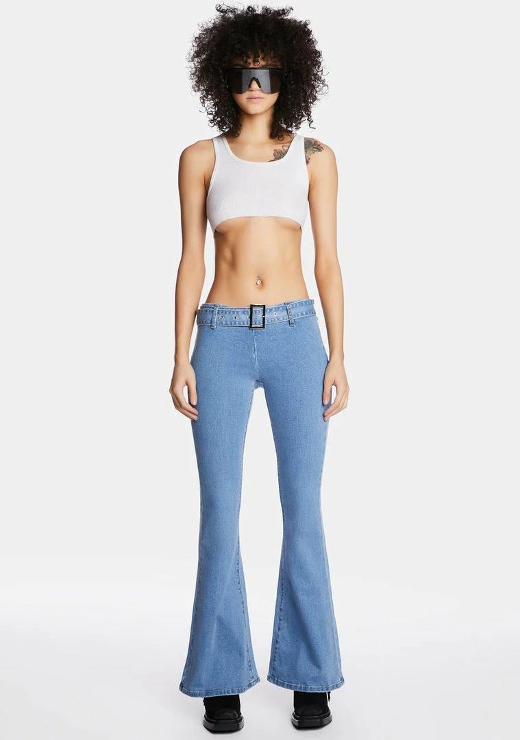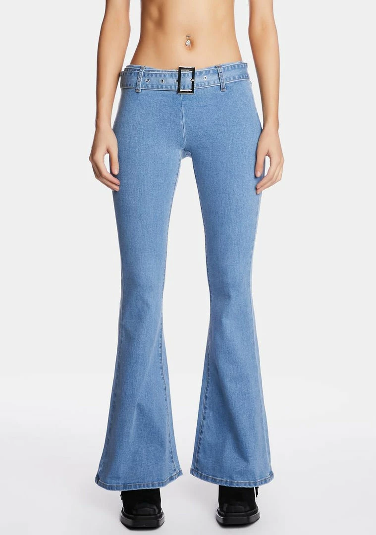 cuz you’re an icon! These flared stretch denim jeans have a mid blue wash, a low rise fit, and a belted detail.