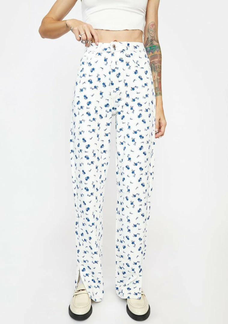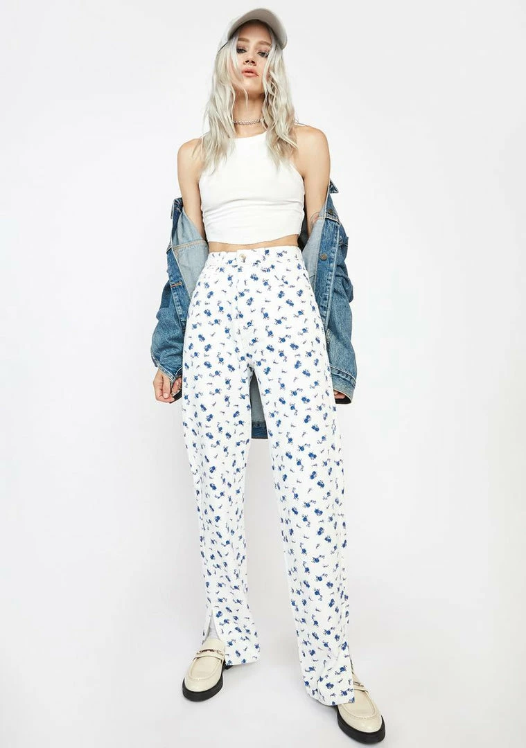 cuz you’re groundbreaking. These straight leg denim jeans have a floral print all over, a high waist fit, functional pockets, and split hems.
