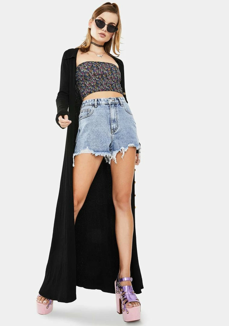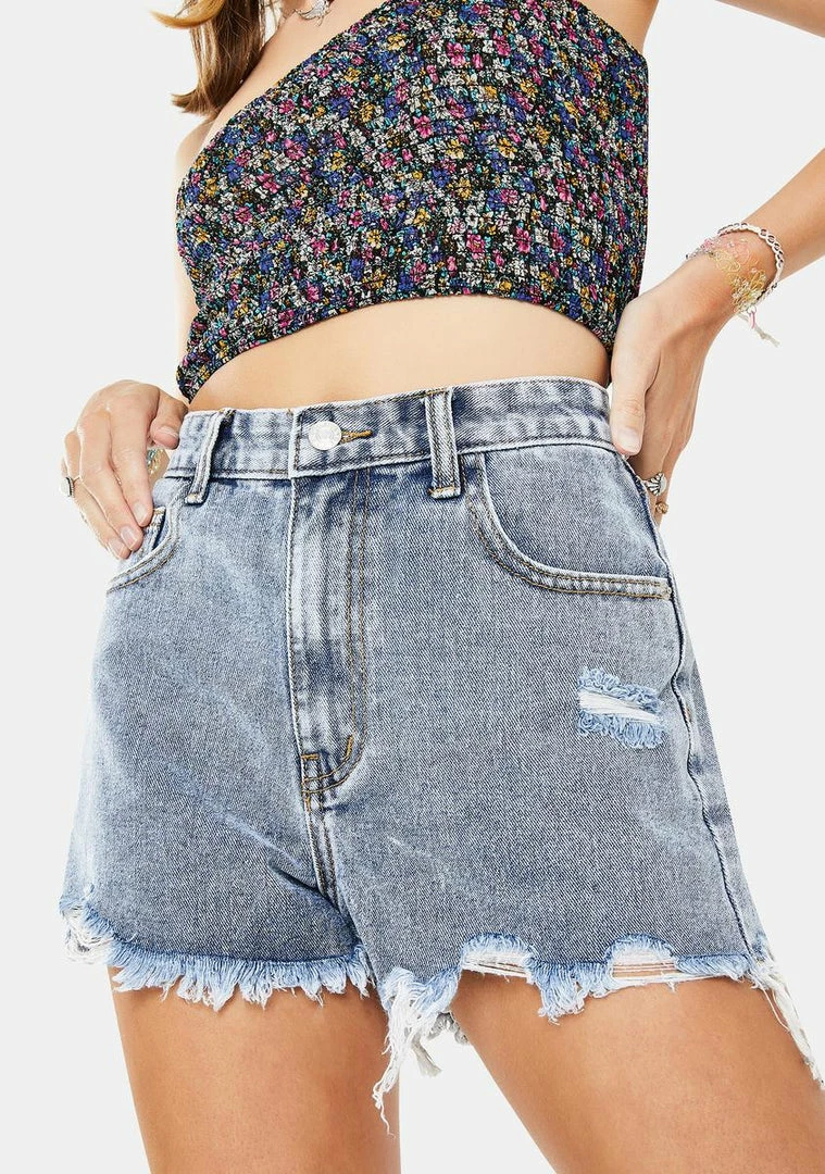 it’z five o’clock somewhere. Check out in these high waist denim shorts that have classic pockets N’ are distressed all ova.
