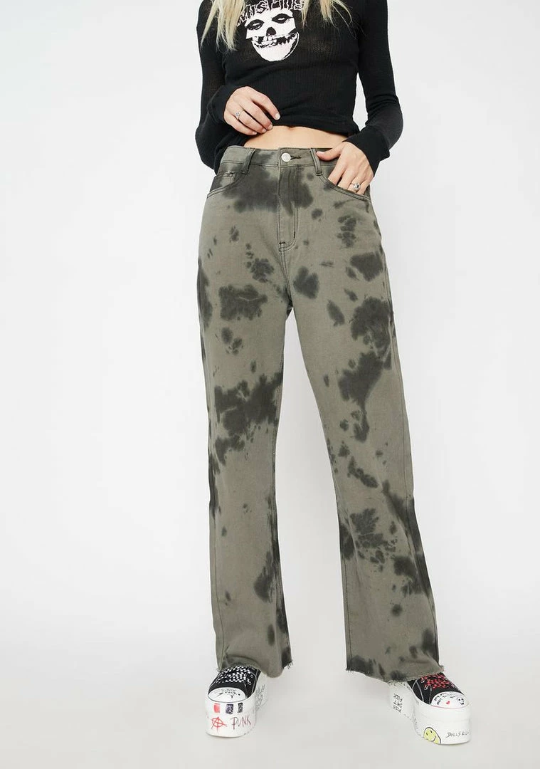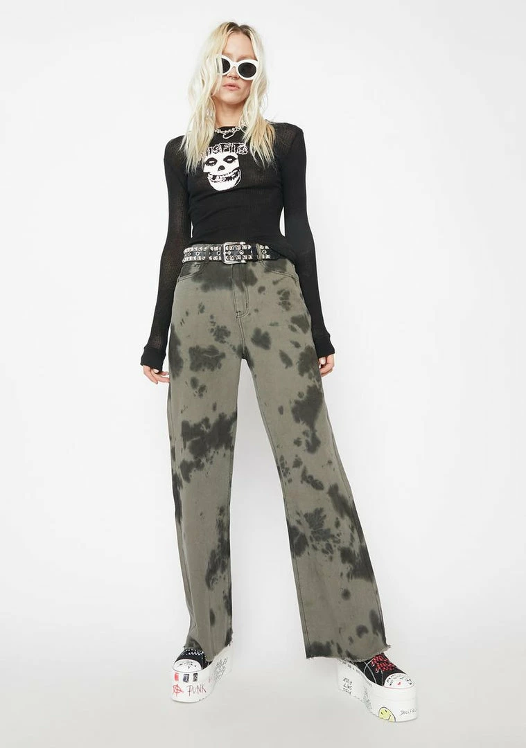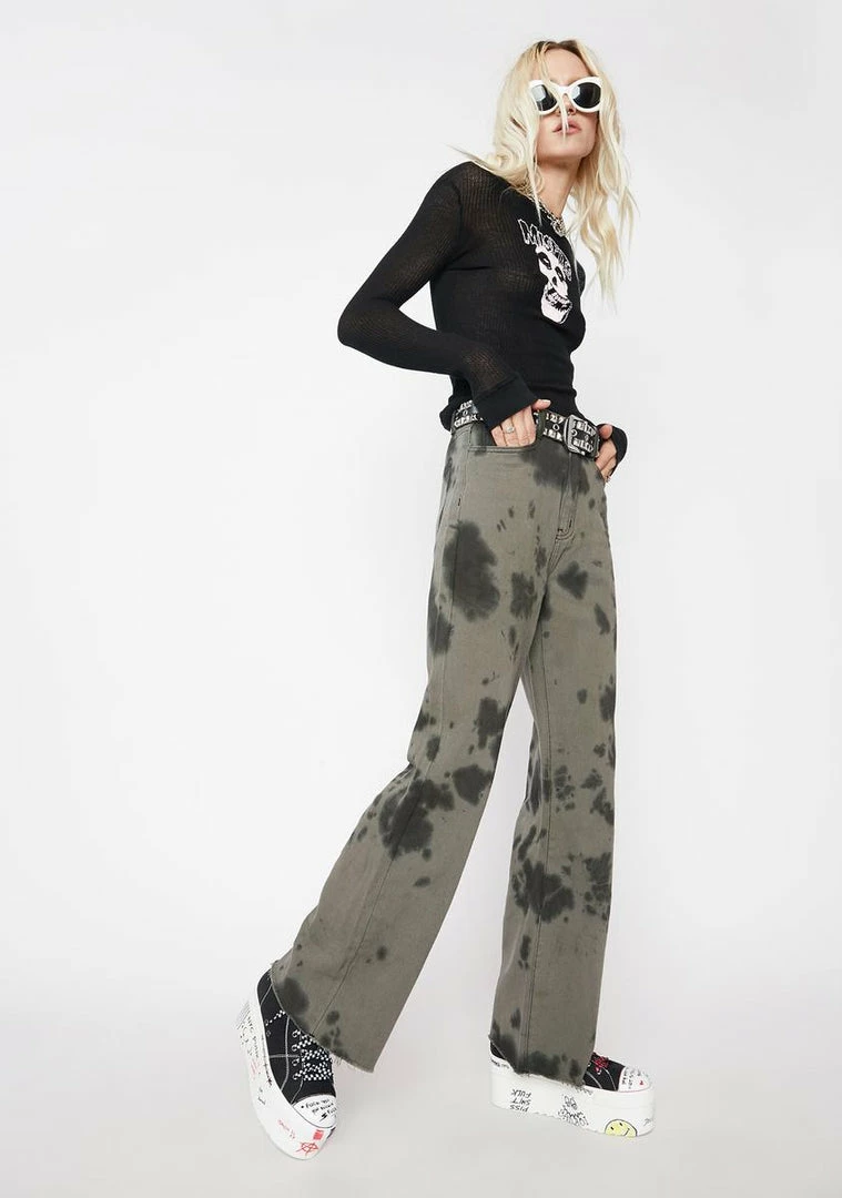 have an all over tie dye print, a mid-rise waist with a zip fly closure, a four pocket design, and a wide leg silhouette.