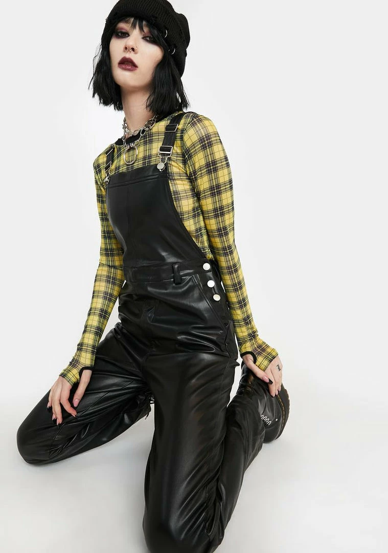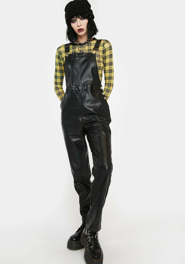 cuz you’re always edgy. These exclusive overalls have a soft vegan leather construction, adjustable braces, side button closures, a tapered fit, and pockets on the front and back.