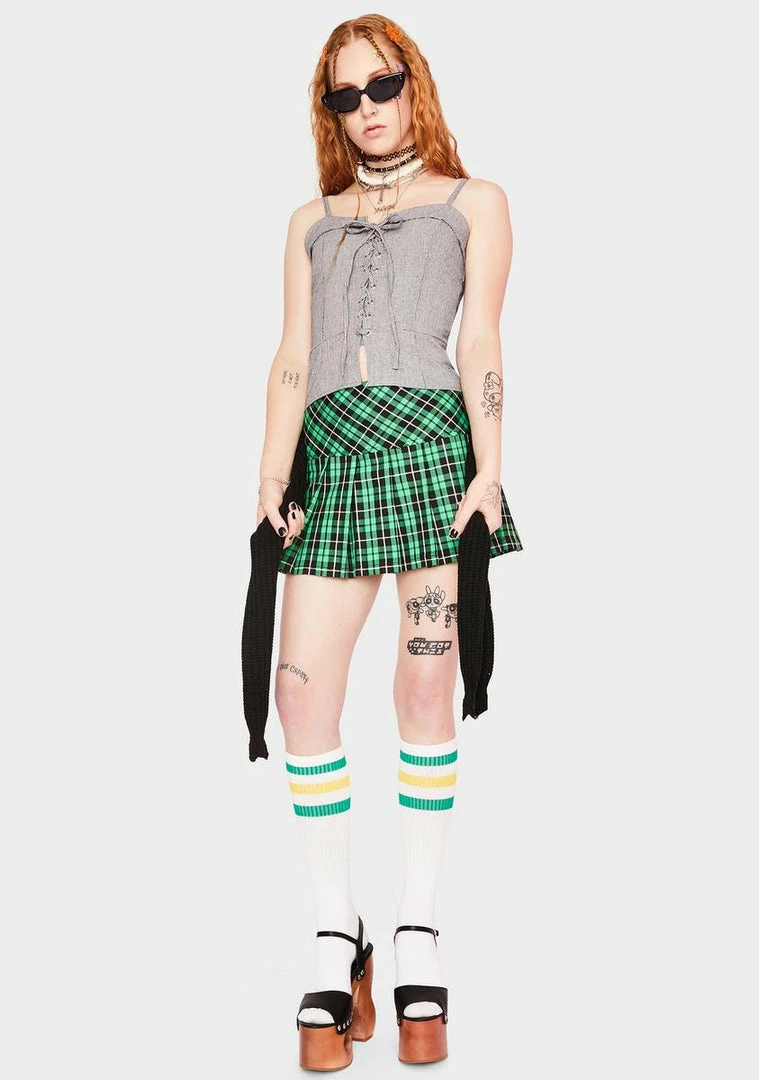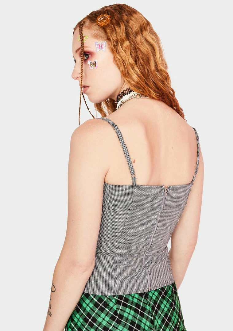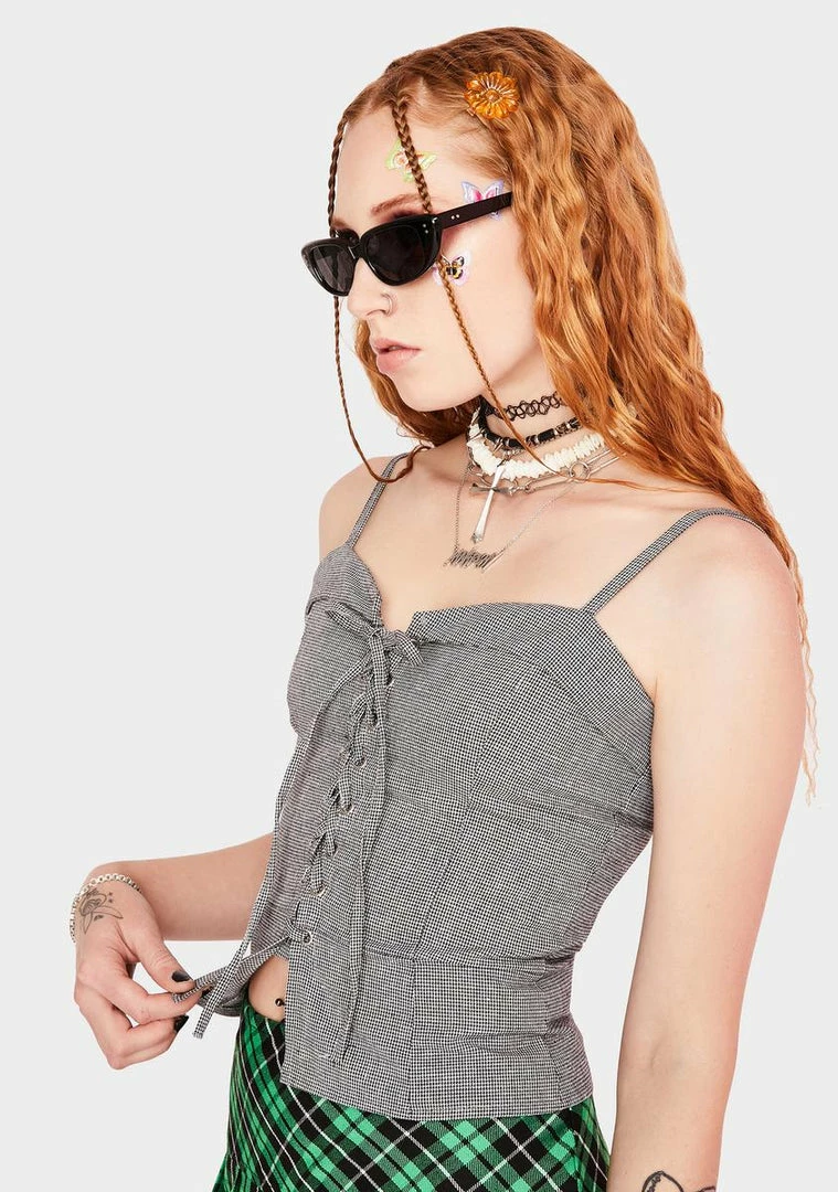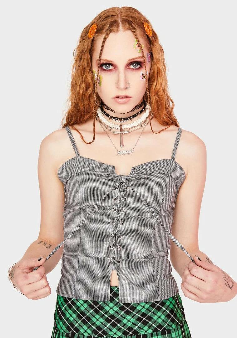 are you feelin’ lucky, punk!? This cami tank top has a lace up front closure, checkered print N’ supa slim fit.