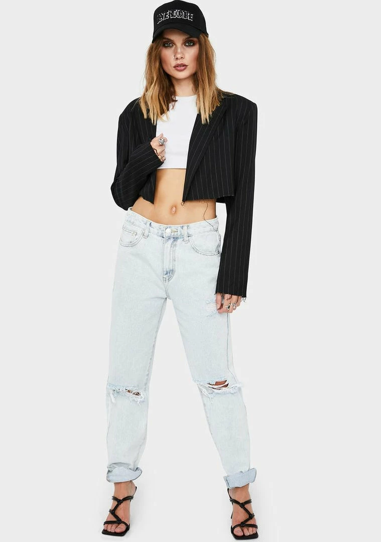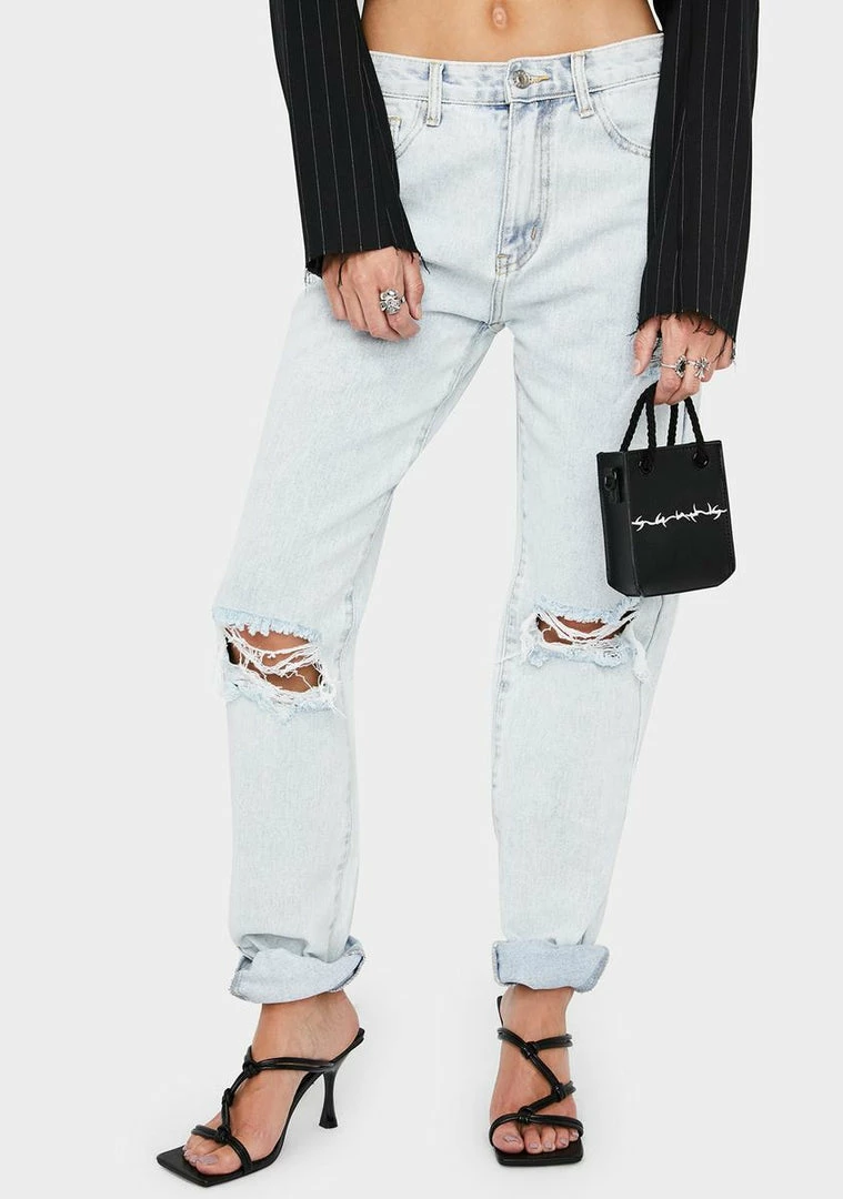 cuz your curiosity never fails to charm âem. These mid rise denim jeans have distressed knee rips, a bootleg cut with cuffed hems, four pockets and button zip closures.