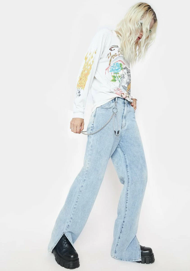 gotcha lookin’ reckless AF. These high waist denim jeans have a light wash, classic pockets, a button fly closure, and slits on the hemline.