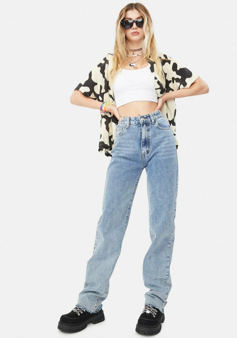 you keep it real. These denim jeans have a mid-blue wash, a straight leg fit, five pocket and a zip fly closure.