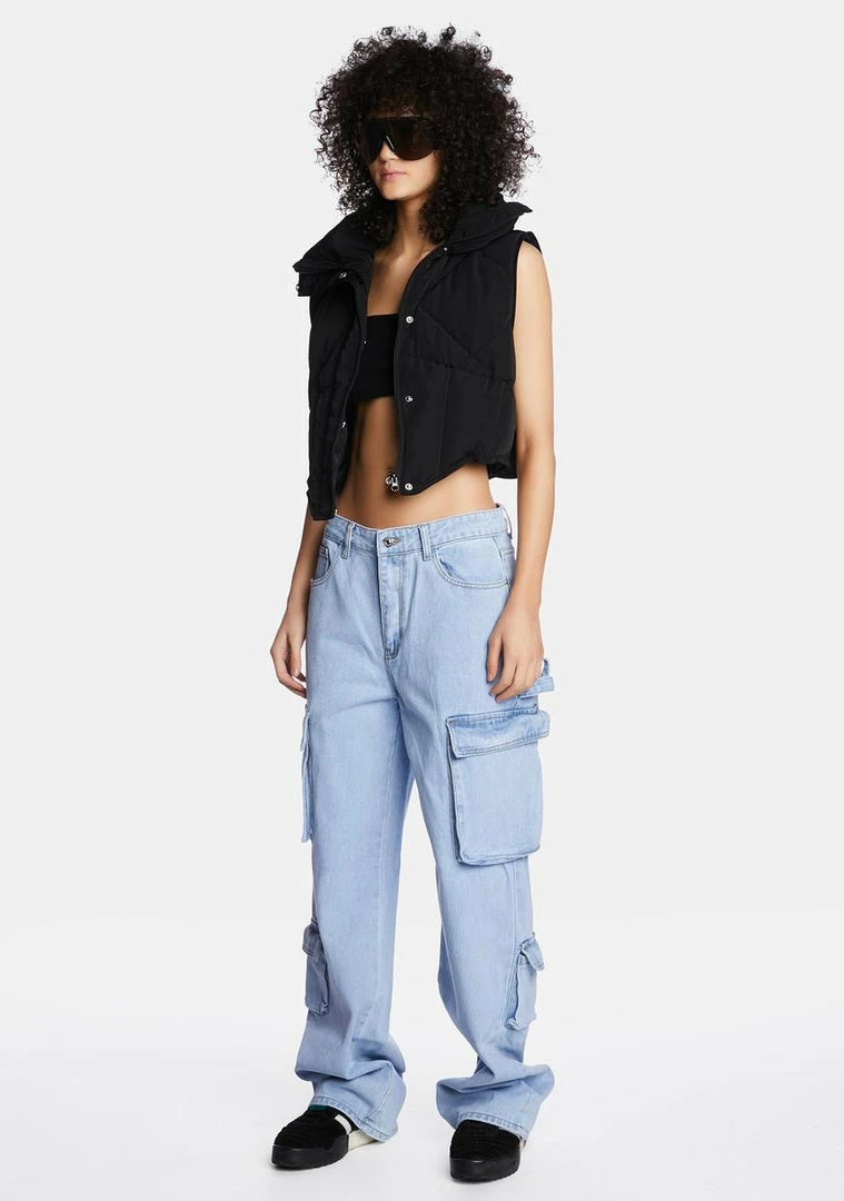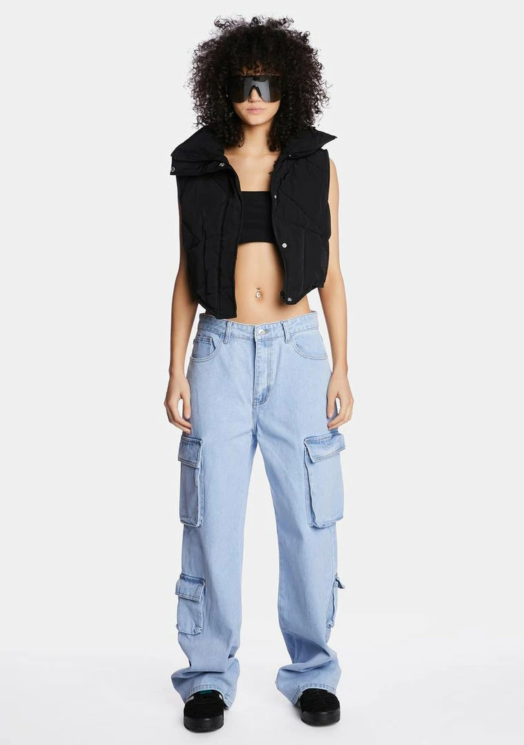 cuz you call the shots. These cargo jeans have a denim construction, a mid rise fit, cargo pockets, regular pockets, chain link detailing, and a button and zip closure.
