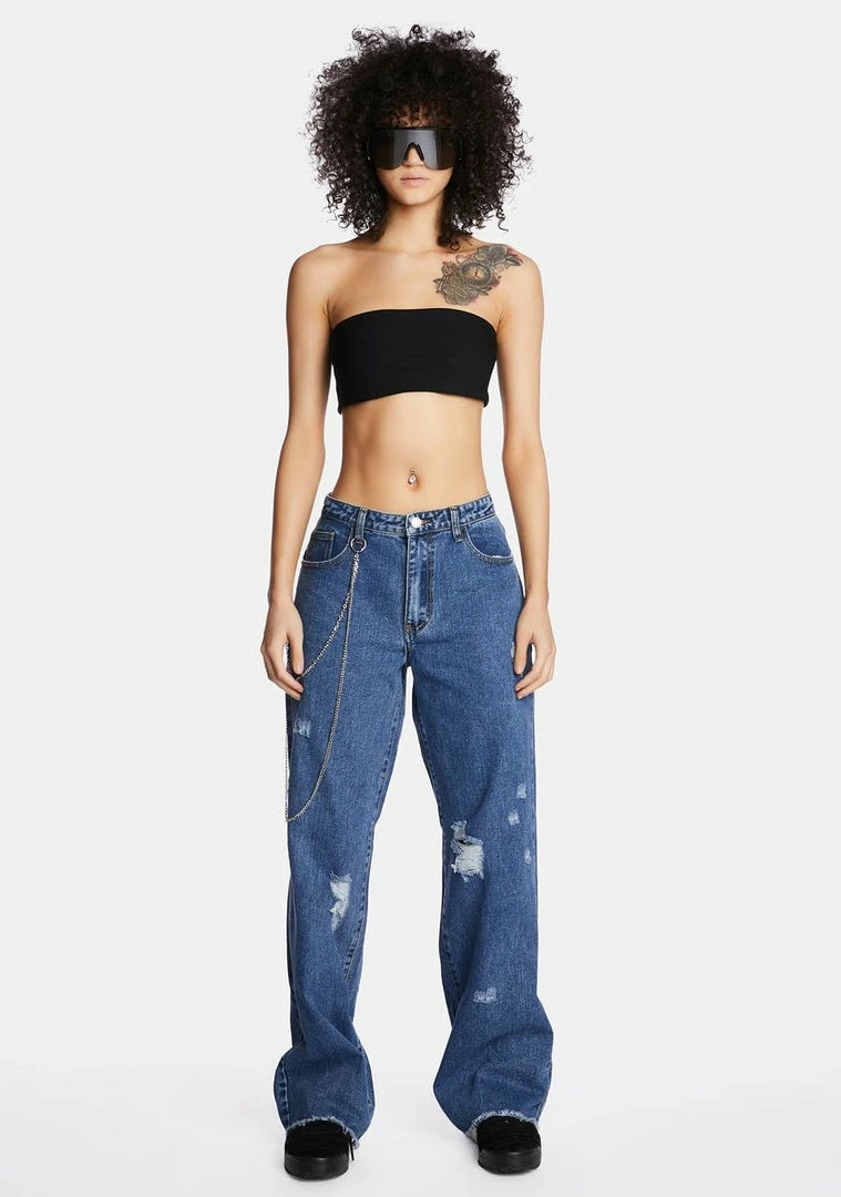 cuz this is the way. These jeans have a denim construction, a mid rise fit, a distressed look, a raw hem, pockets, O-ring hardware, chain link detailing, and a button and zip closure.