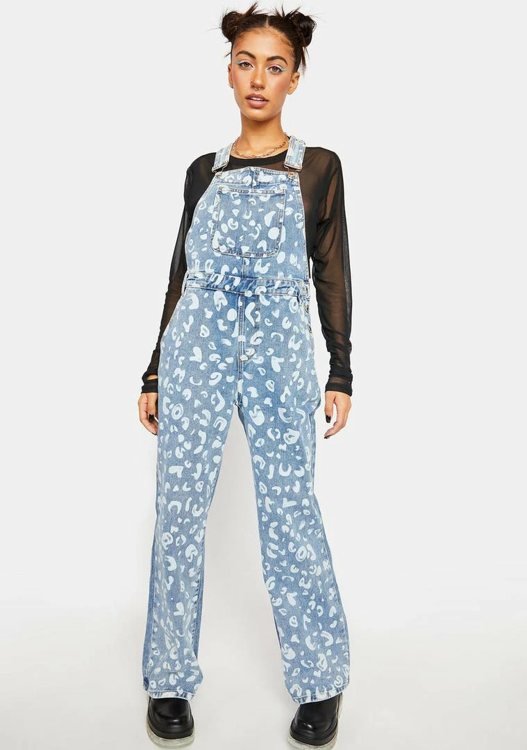 stay sassy. These denim overalls have a light-wash design, a painted leopard print all over, adjustable shoulder straps, a bib pocket, side button closures, and a straight leg fit.