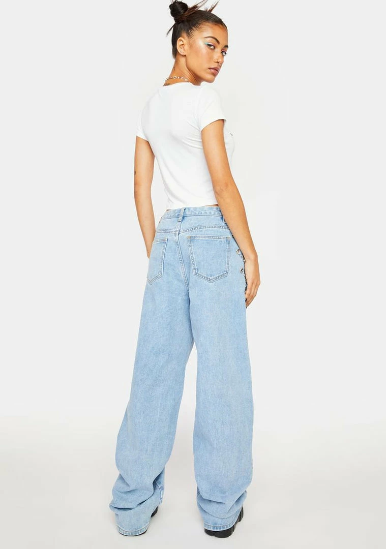 make ’em go mad. These denim jeans have a high-rise waist, side cutouts at the hips with lace up chain details, a relaxed baggy fit, and a zip fly closure.