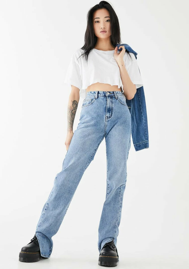 gotcha lookinâ reckless AF. These high waist denim jeans have classic pockets, button fly closures Nâ slits on the hemline.