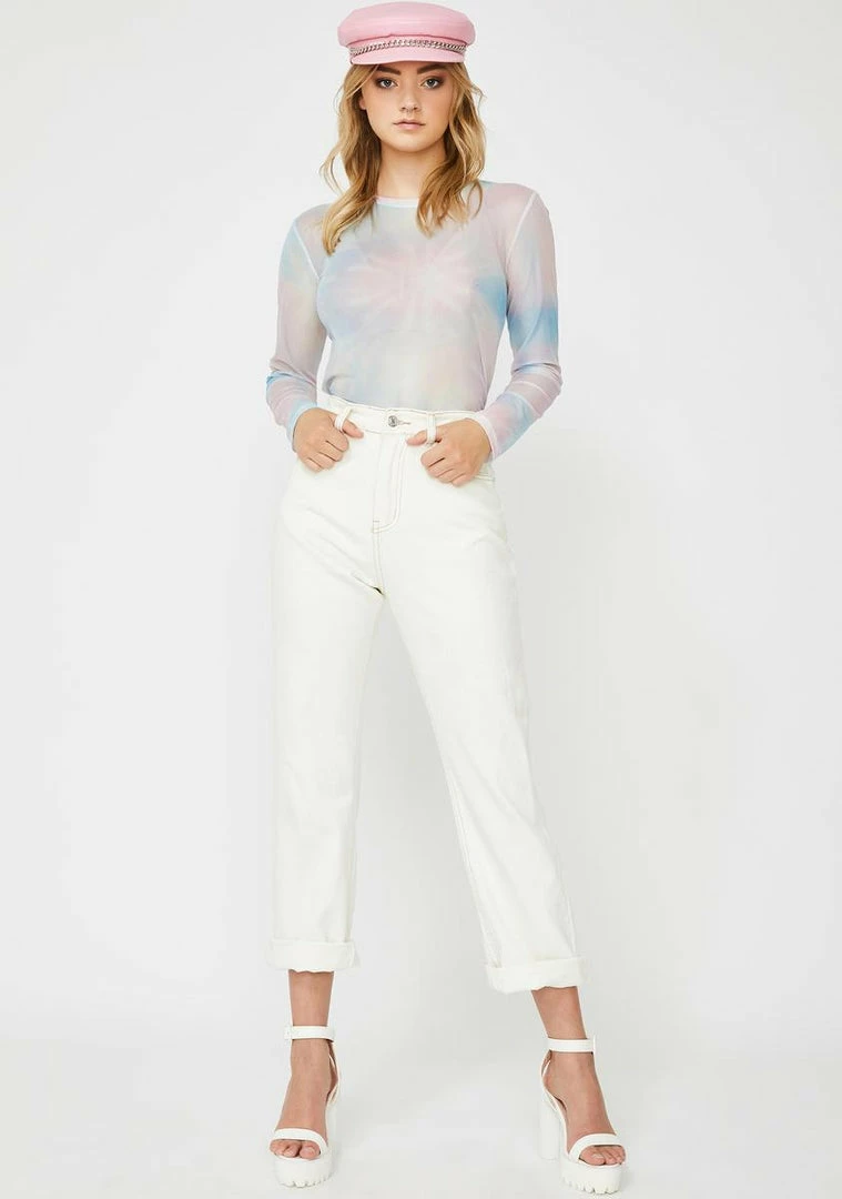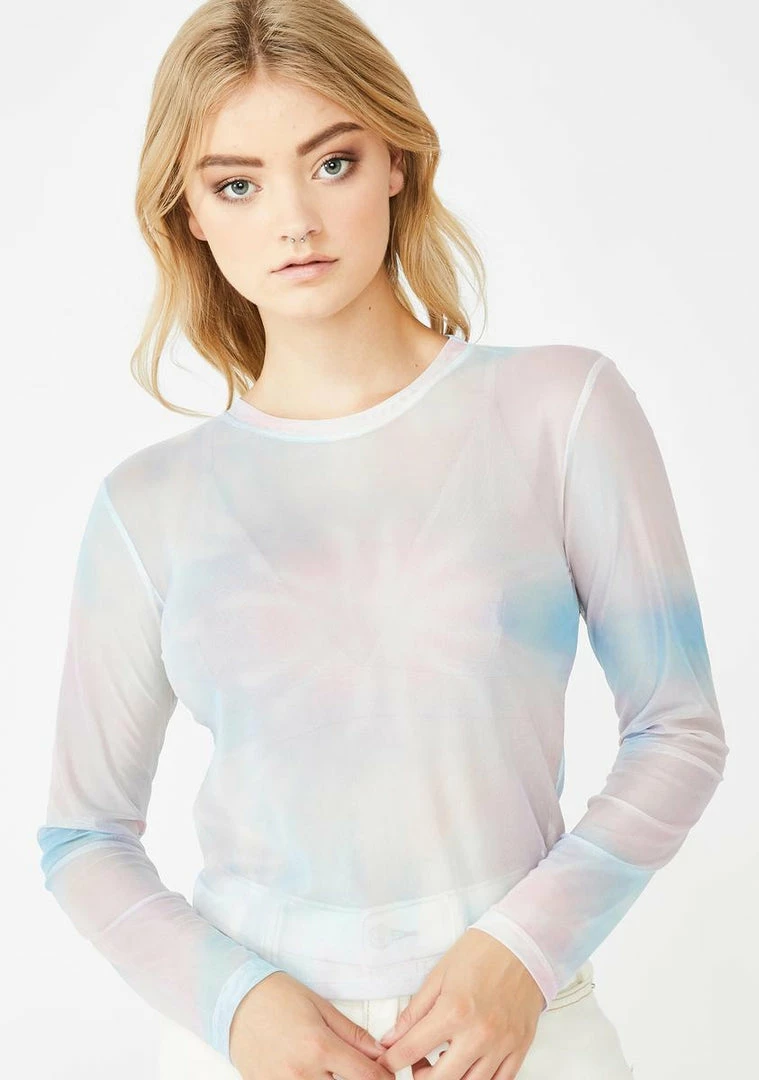 cuz youâre not from this planet, bb! Youâre too cute in this long sleeve mesh top that has a round neckline, a slim fit, and a tie dye print all ova.