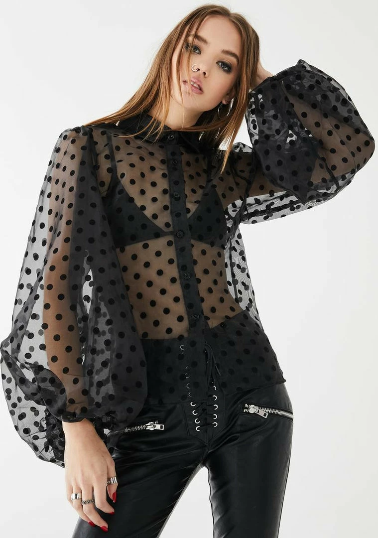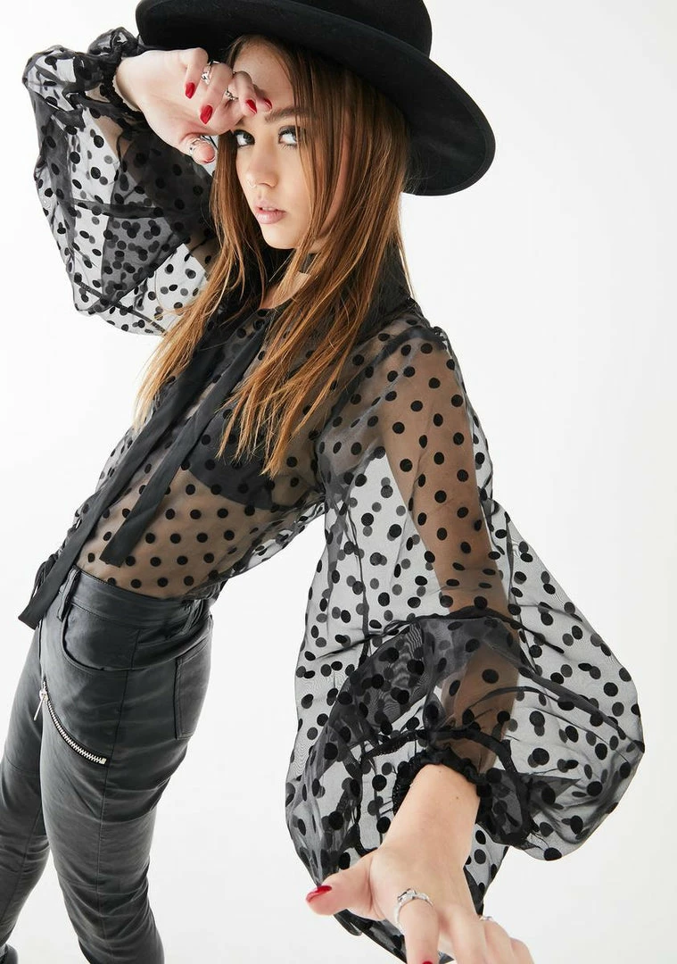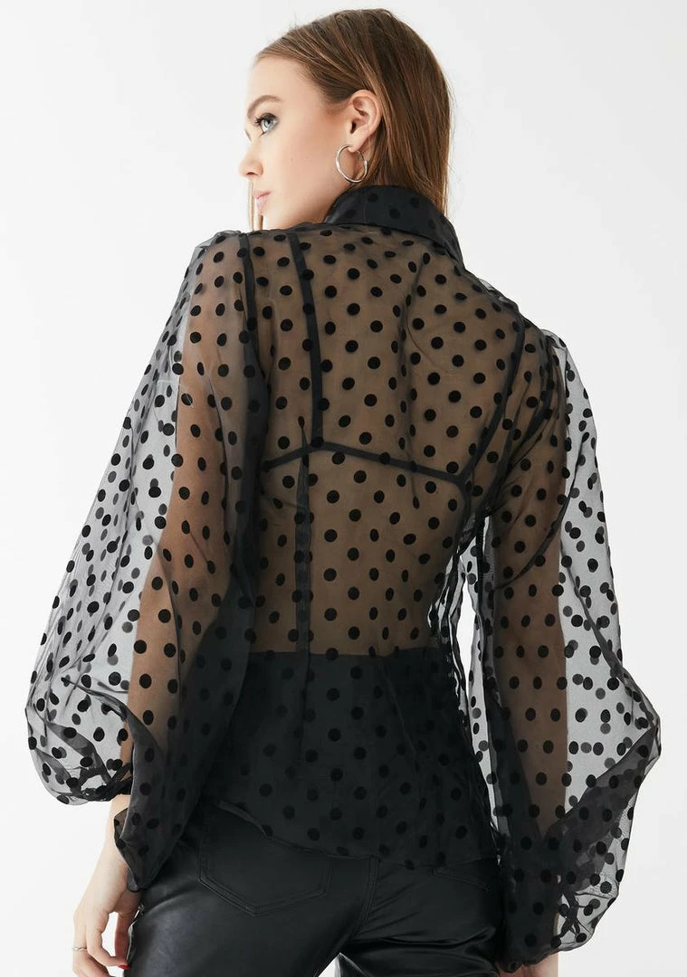 cuz you never settle for less! Give âem something to talk about in this posh sheer collared top that has an adorable polka dot print, long balloon sleeves, and a button up front.