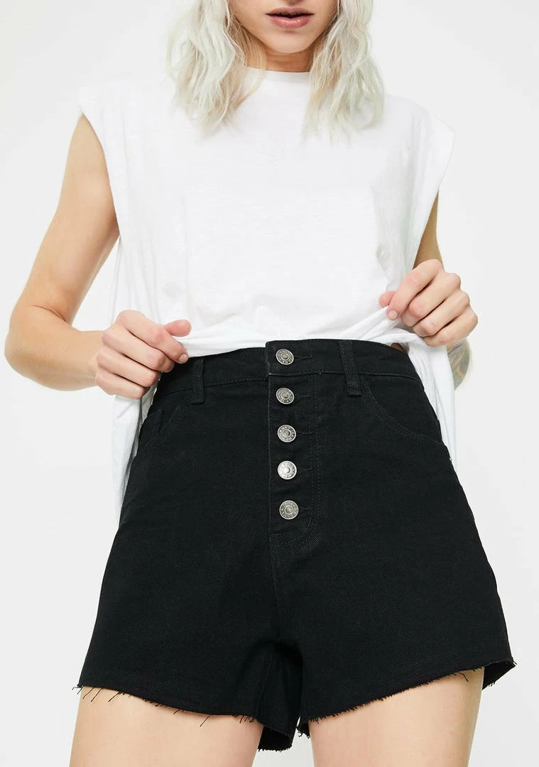 cuz this Darby stays out past curfew. Look dope AF in these high waist denim shorts that have front button closures, classic pockets Nâ raw hemline.