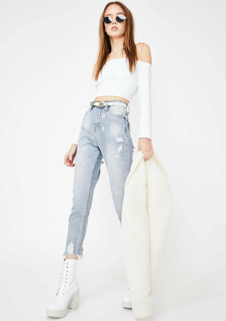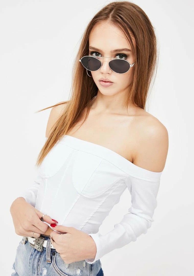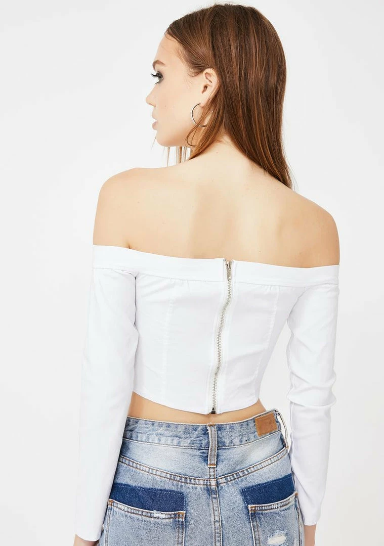 got âem giving into temptation, bb! Show âem how you bring it to tha scene in this off the shoulder crop top with a corset construction, long sleeves and a back zipper closure.